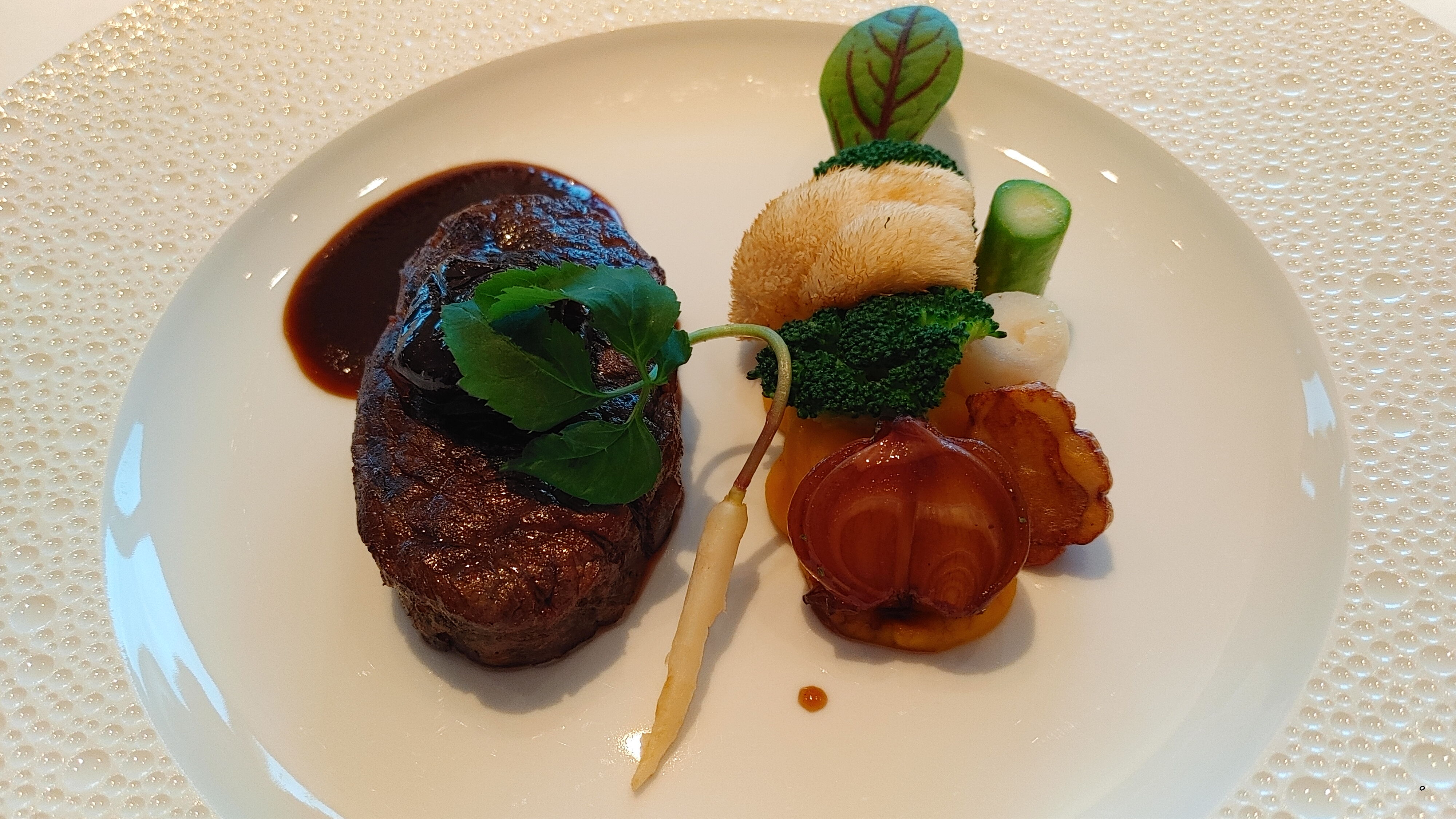 '참숯에 구운 국내산 한우안심 스테이크와 제철야채구이' 누르끼기하며 보들보들 털같은 것이 노루궁뎅이 버섯이라고하네요. 전반적으로 부두럽고 맛있었습니다.