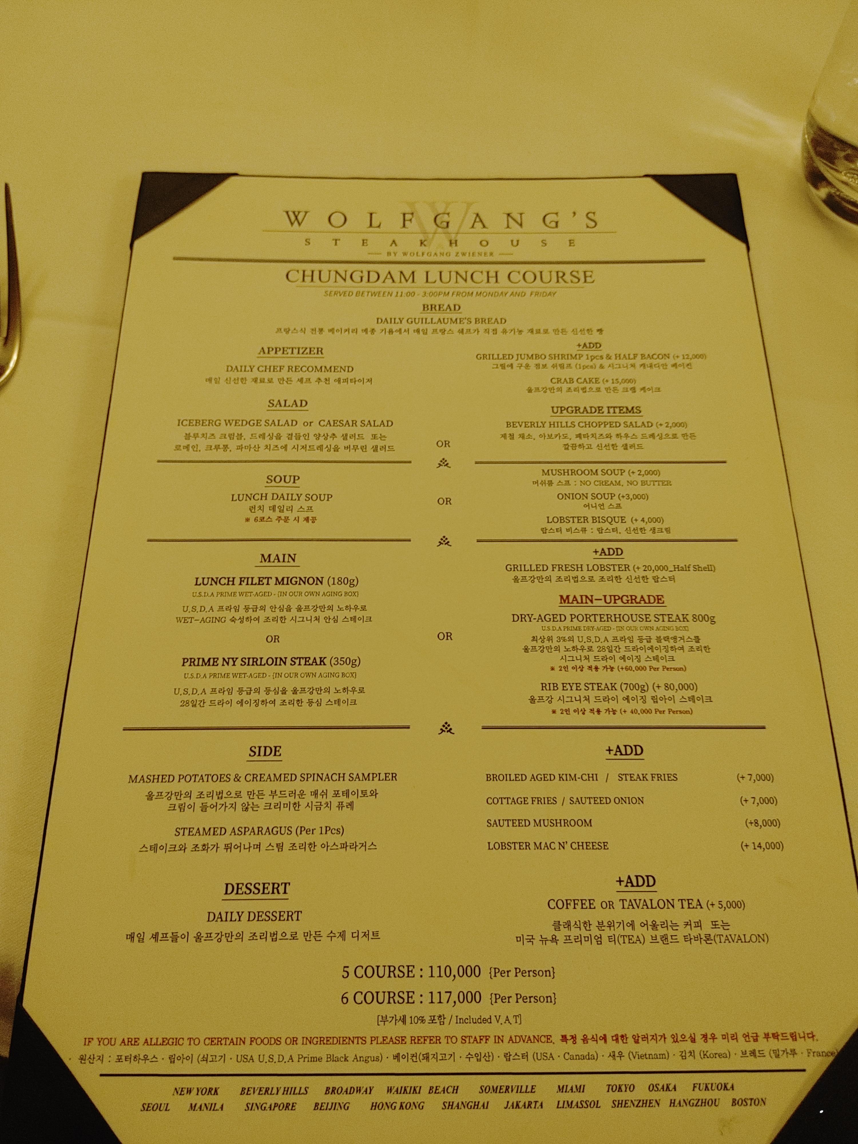 울프강 스테이크하우스는 미국 뉴욕의 3대 스테이크 중의 하나라고 하네요. 그래서 그런지 스테이크 맛이 좋은편이예요.