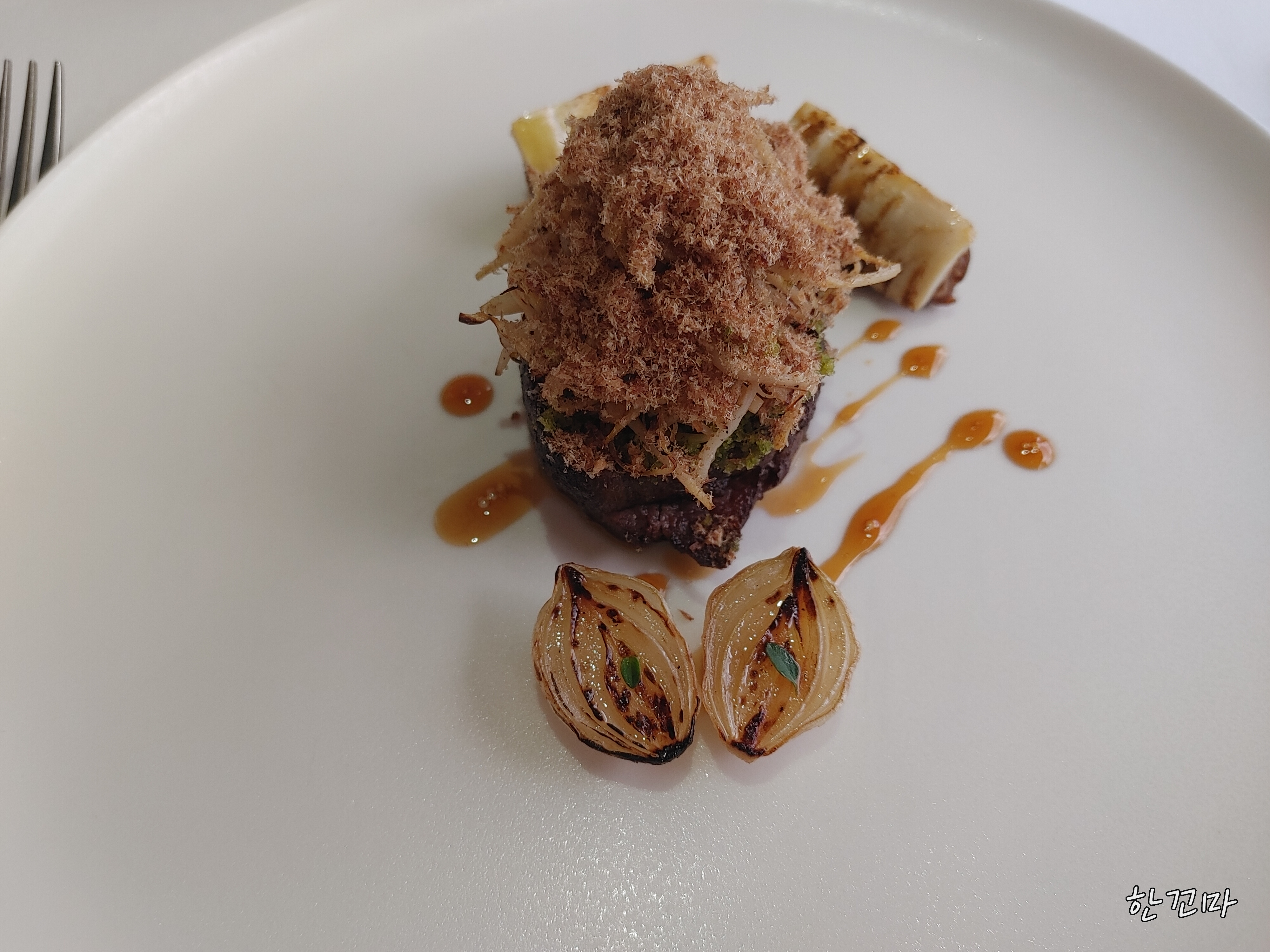 위의 사진은 주옥의 맛으로 불리우며 메추리알 위에 캐비아와 아래쪽에 전복이 있고 잔은 들기름으로 채워져 있습니다. 맛도 좋고 향도 좋고 영양도 좋을 것 같았습니다.