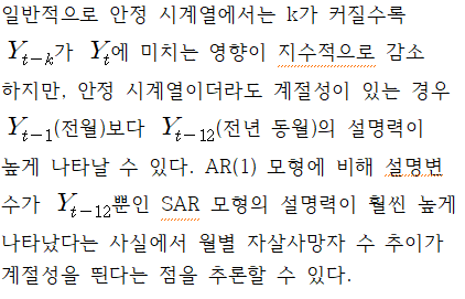따라서 자살은 계절성이 강한 사건으로 이해할 수 있다. 자살사망자 수를 예측하는 이론적 모형은 없고, 시계열 모형에 분기별 가변수를 추가하는 것에 대한 명확한 이론적 근거를 제시하기는 어려우나 지금까지의 회귀분석 결과를 바탕으로 (6)번 모형에 분기별 가변수를 추가하여 분석하고자 한다.
