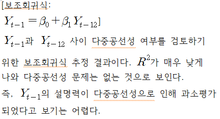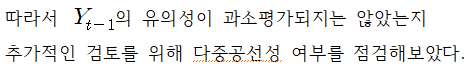 전월보다 전년 동월의 자살사망자 수가 당월의 자살사망자 수에 대한 설명력이 훨씬 높으며, 자살은 계절성이 뚜렷한 사건임을 추론할 수 있다. 다중공선성이 있는 경우 두 변수가 jointly significant하면서 개별 계수추정치는 유의성이 없게 도출될 수 있다.