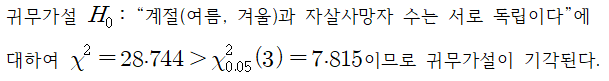 5-10월을 여름으로, 그 외 기간을 겨울로 간주하여 2019년-2022년 월별 자살사망자 데이터에 대해 chi-square test를 실시하였다.