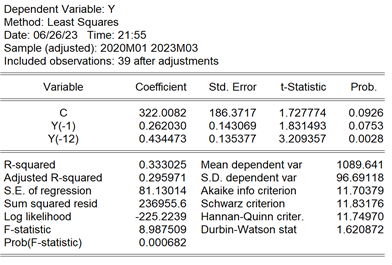 AR(1) 모형의 설명력이 매우 낮게 나타나는 이유를 찾기 위해 시계열 Y의 그래프를 검토하자. 시계열 Y의 그래프는 다음과 같다. (t=1,2,3,.....,51, X축에서 1은 2019년 1월, 51일은 2023년 3월에 해당함)