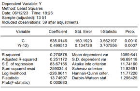 ADF test 결과, p-value = 0.0002 < 0.05로 나타났다. 귀무가설은 ‘Y가 단위근을 가진다(Y has a unit root)’는 것이므로, 귀무가설이 기각되는 것은 Y가 안정 시계열임을 시사한다. Y는 안정 시계열이고, 자료 분석 시 MA 모형보다는 AR 모형이 일반적으로 자주 이용되므로 Y에 AR 모형을 적용해보자.