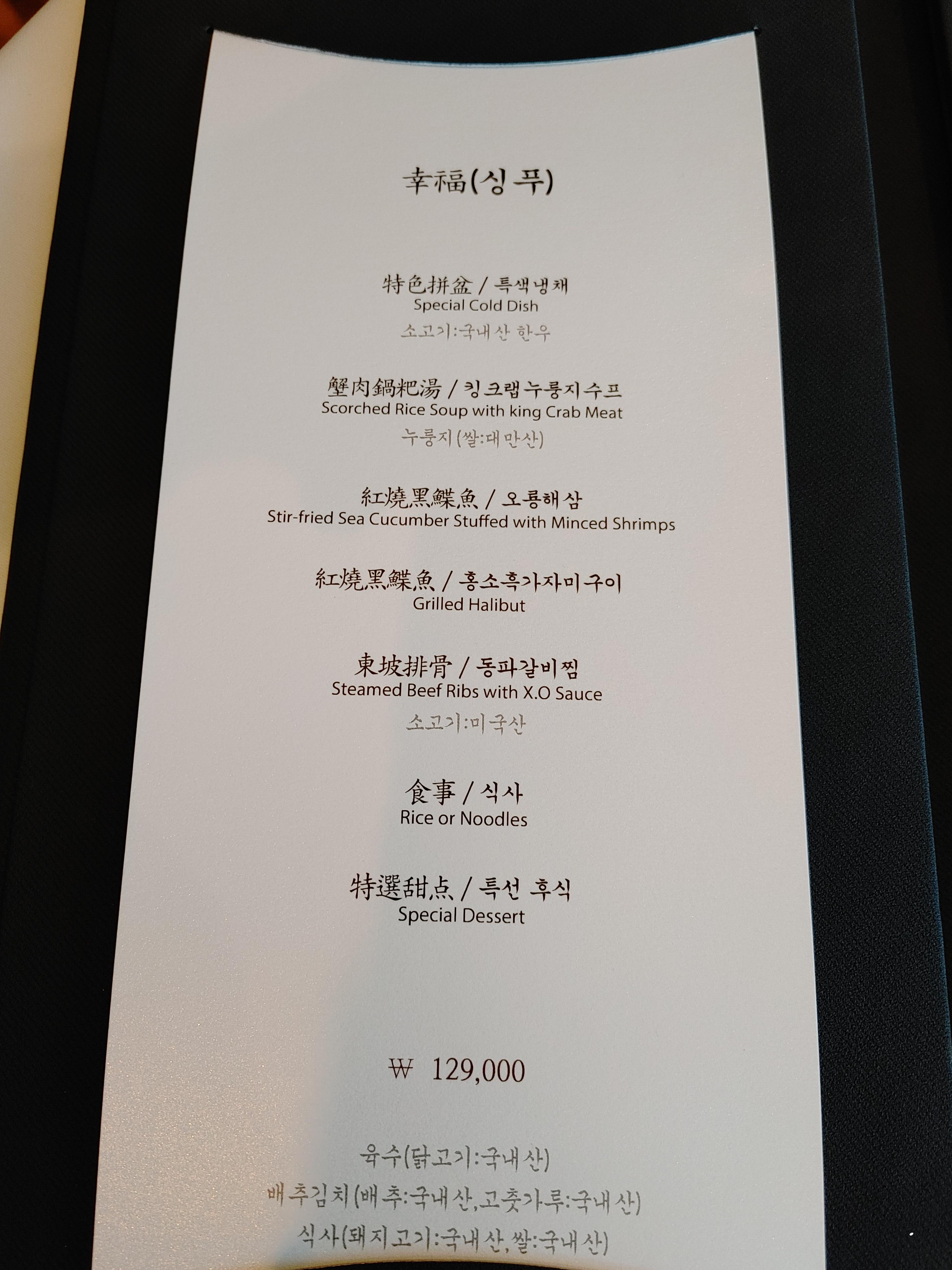 행복(싱푸)이라는 메뉴로 주문했어요. 말그대로 행복한 식사 시간이 될 것 같습니다. 여긴 맛도 좋지만 창밖으로 한강을 보면서 식사를 해서 기분도 좋아져요. 왜 한강변 아파트가 비싼지 알 것 같아요.