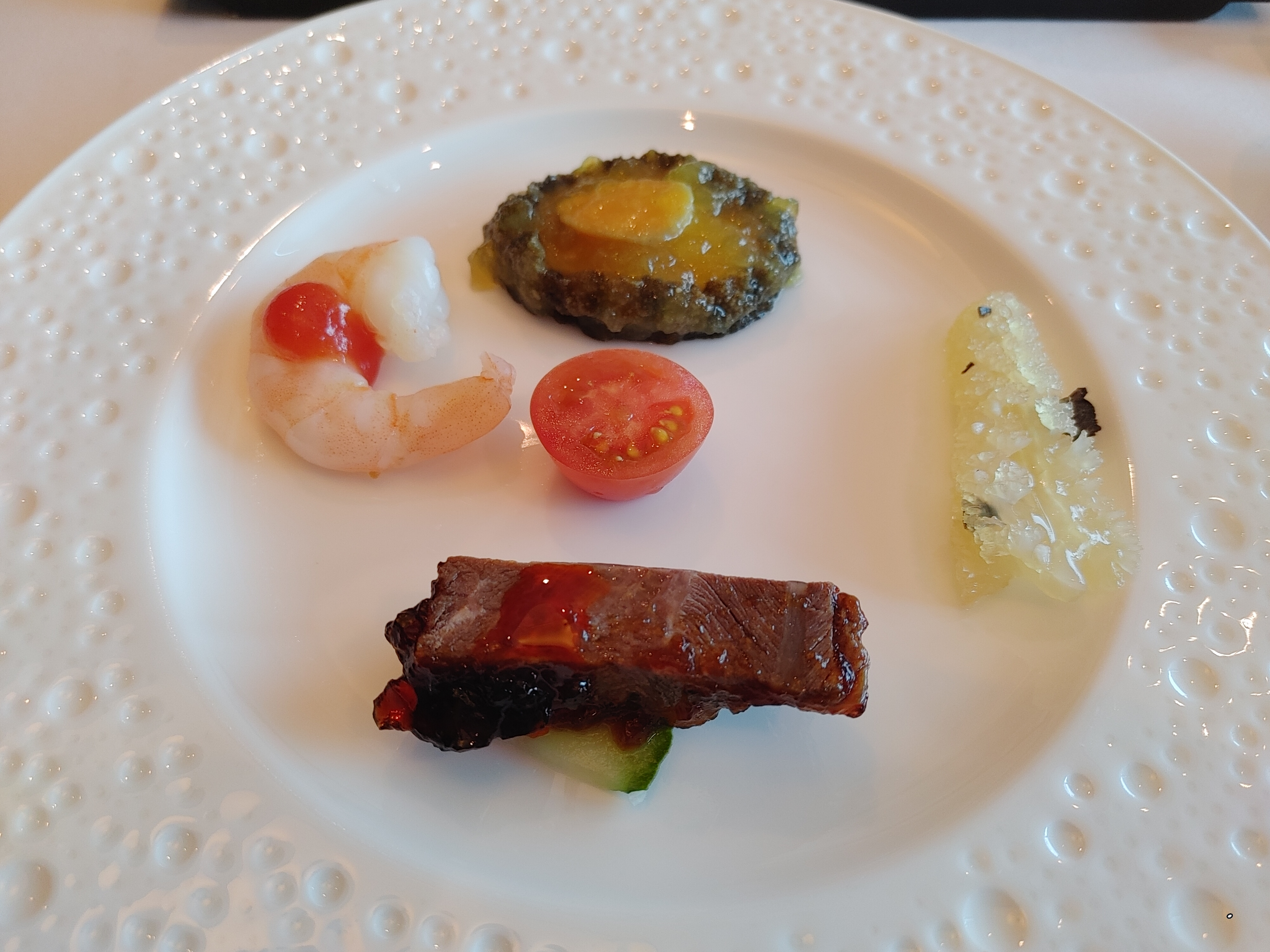 전복, 해파리, 소고기, 새우, 방울토마토로 이루어져있습니다. 크기도 적당하고 식사를 시작할때 가볍게 입맛을 돋구어 주는 용도로 제공되는 듯합니다.