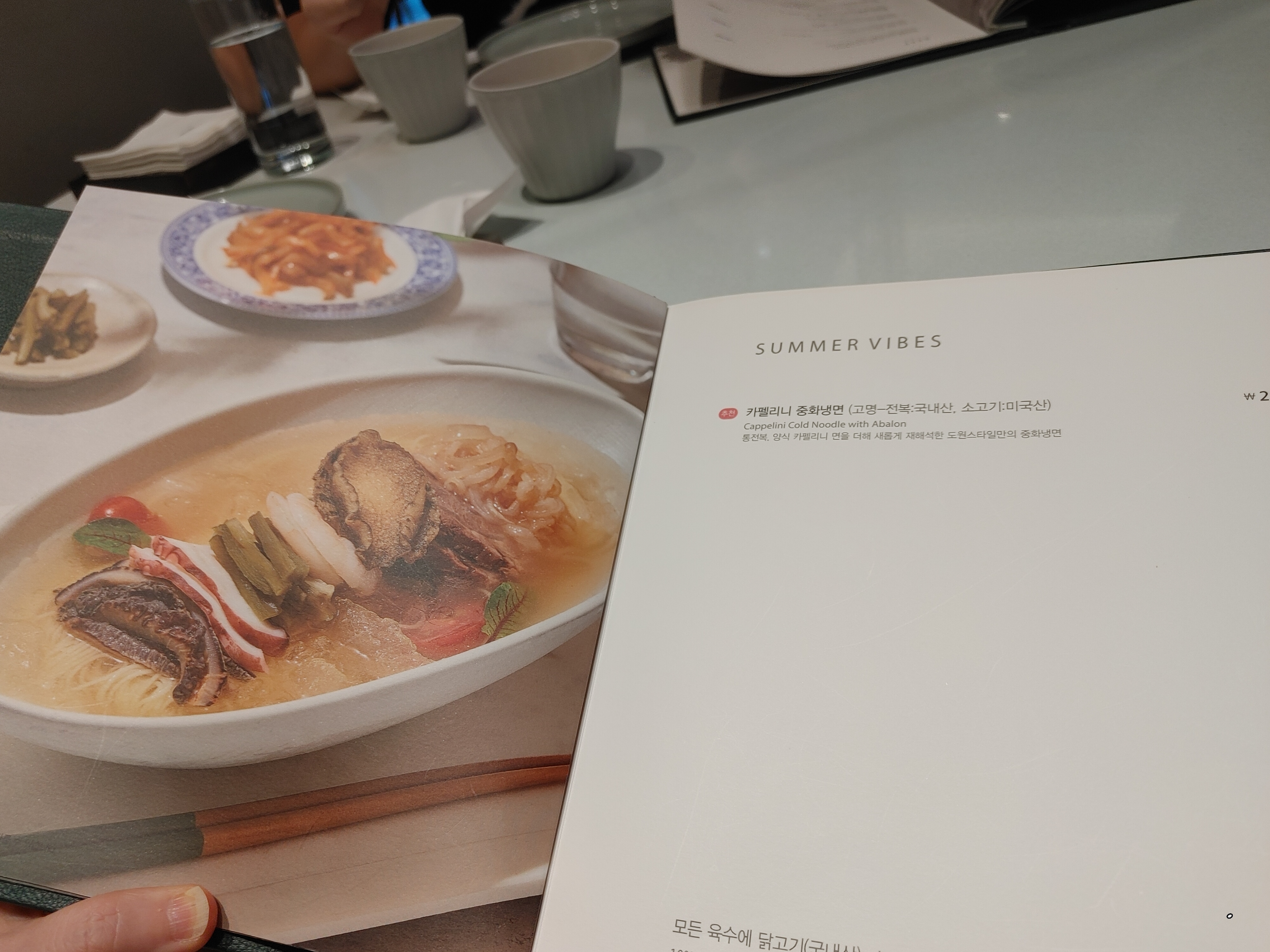 오늘은 코스로 안시키고 개별 음식으로 시켰습니다. 블랙페퍼 몽골리안 비프와 그린파파야 유린기를 시키고 동생과 나는 랍스터 스파이시 누들, 어머니는  냉면을 좋아하셔서 카펠리나 중화냉면을, 아버지는 도원 팔진덮밥을 주문하였습니다.
