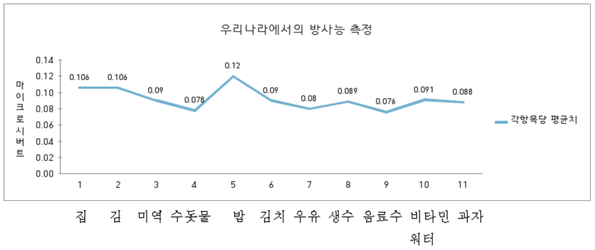 탐구결과 다행히도 우리나라 서울의 살고 있는 집에서와 흔히 접하는 먹을 것, 음료수 등에서는 평균 0.1μSv/h 전후로 안심해도 될 방사능 수치가 체크되었다.
