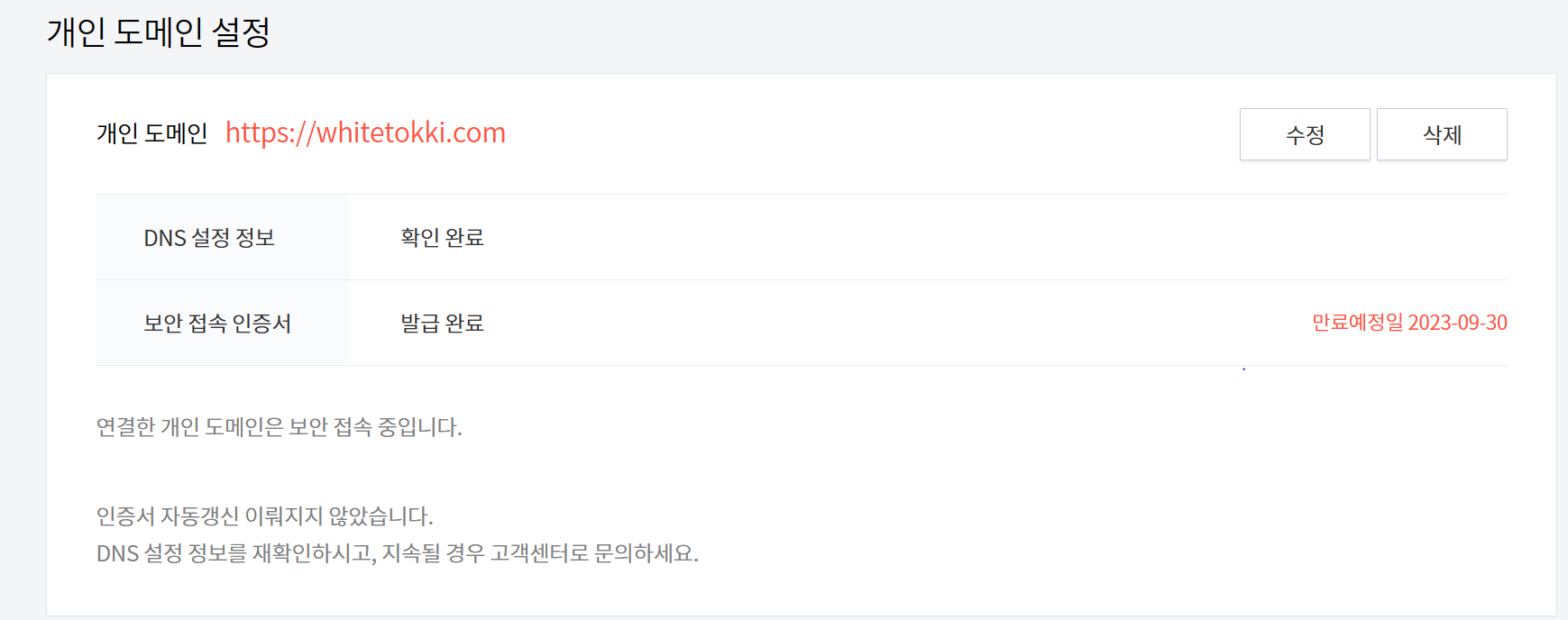 이게 다른 분 하신 것 보니까 개인도메인 설정에서  삭제를 눌러 만료된 보안인증서를 삭제시킨 후 다시 개인도메인 이름을 기재한 후 기다리면 2~3 시간 안으로 보안접속인증서가 재발급되면서 해결되는 것 같더라고요.  다음에 또 다시 그러면 수동삭제후 다시 도메인 기재하고 기다려 봐야겠어요.