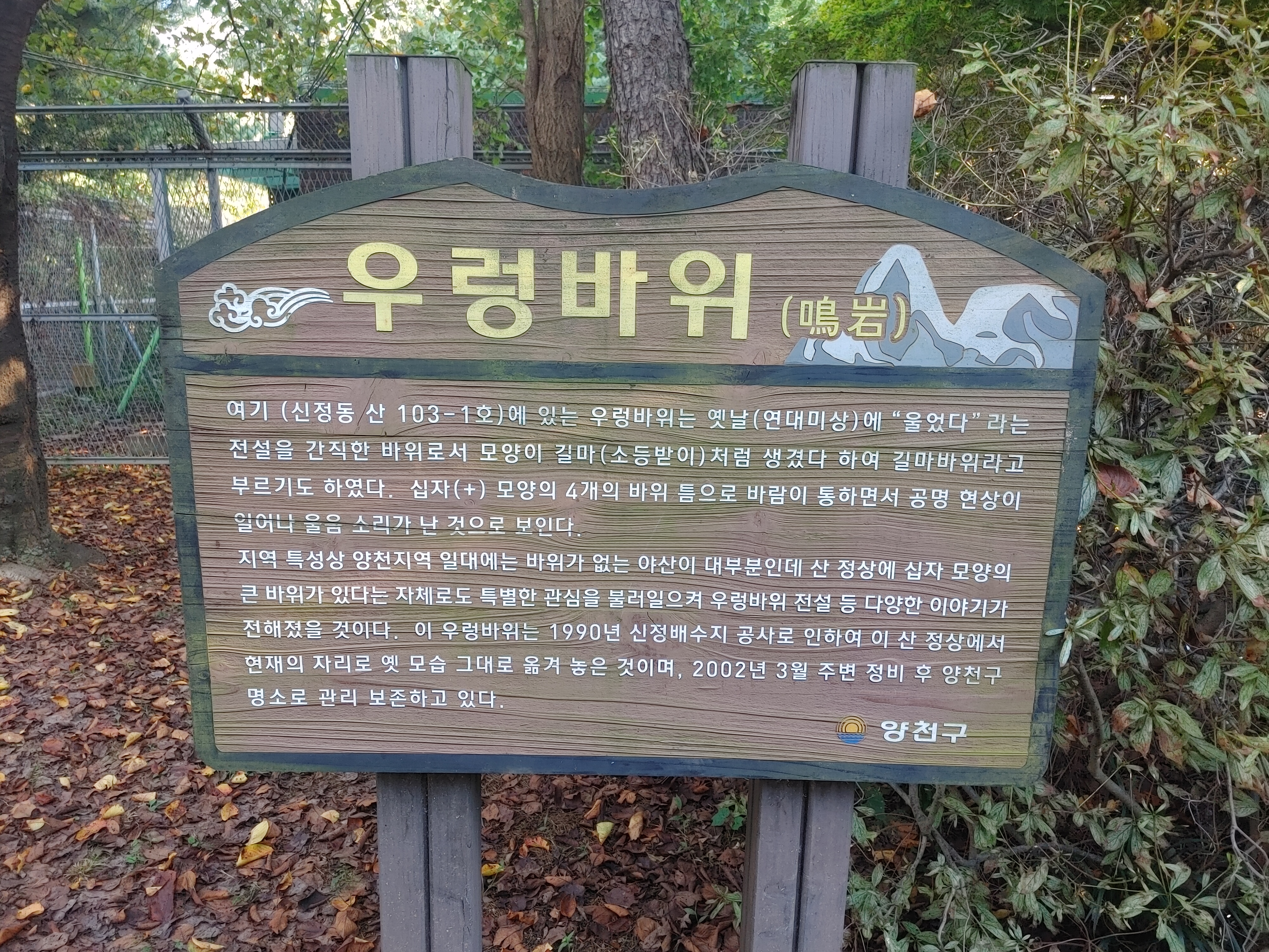 산 정상에 십자모양의 큰바위가 있는데 우렁바위라 칭하는데 4개의 바위 틈사이로 바람이 통하면서 공명현상이 일어나 울음 소리가 난 것으로 보인다고 합니다.