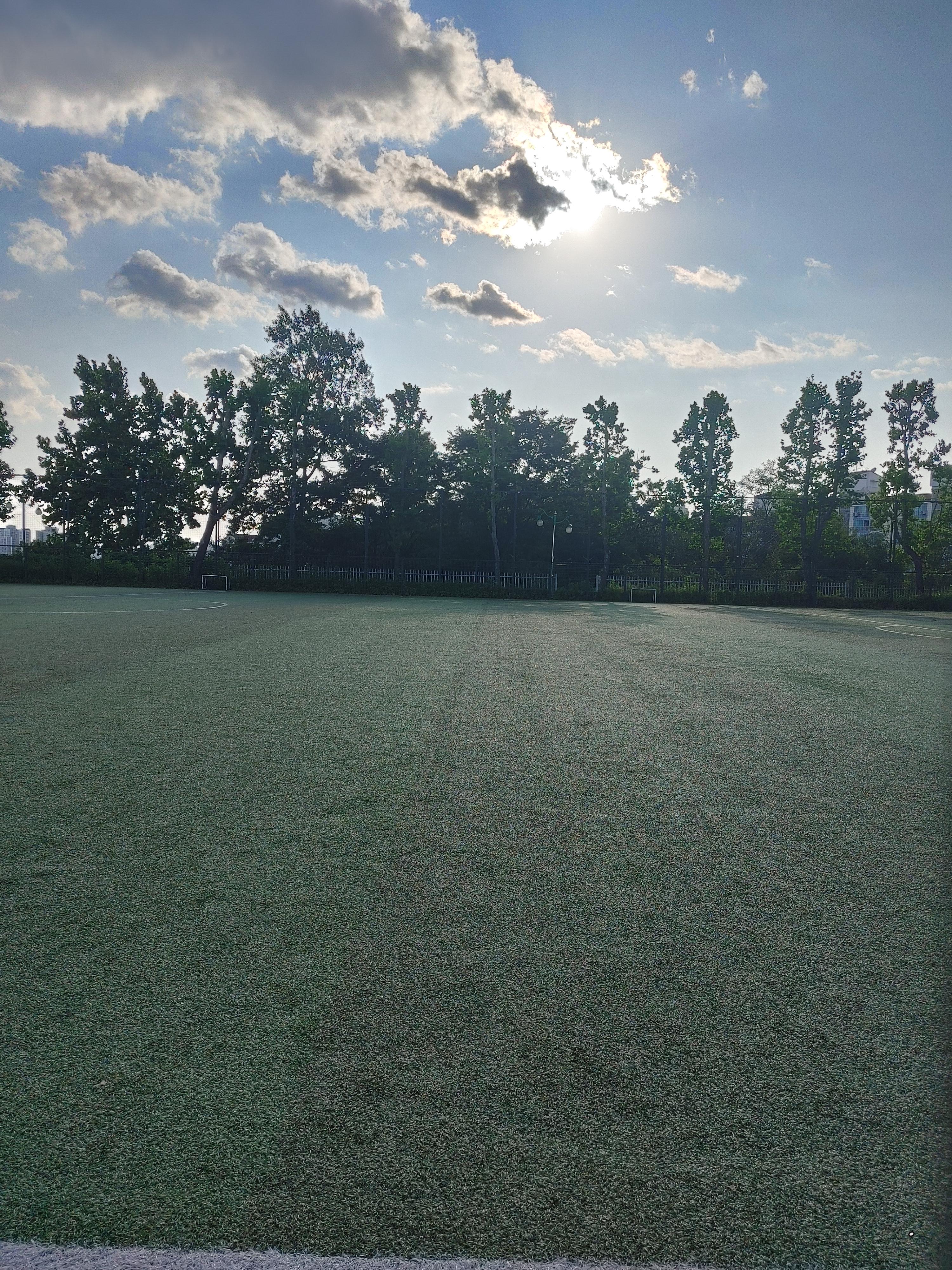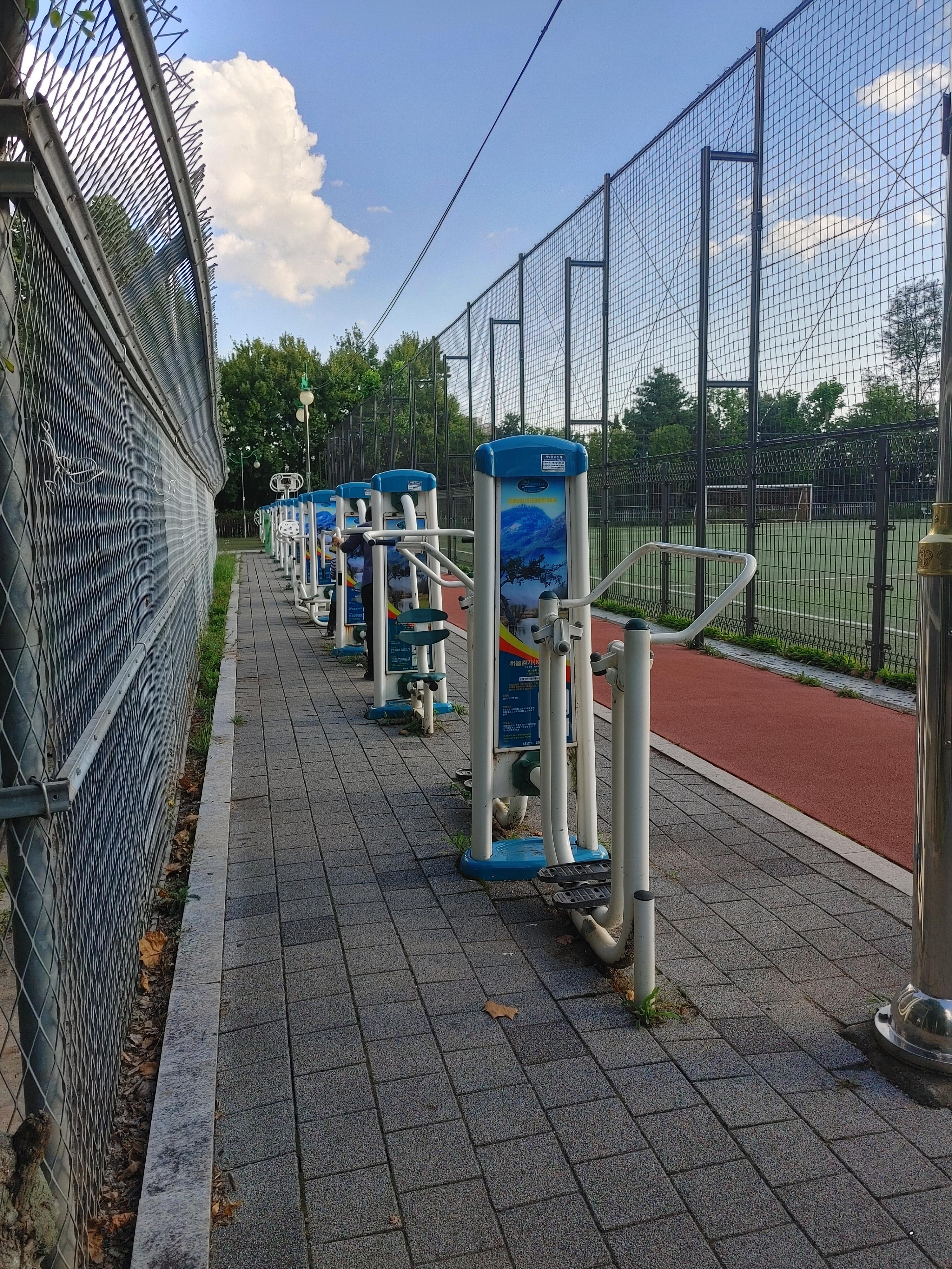 축구장 근처에 체력단련 기구들이 설치되어 있습니다.