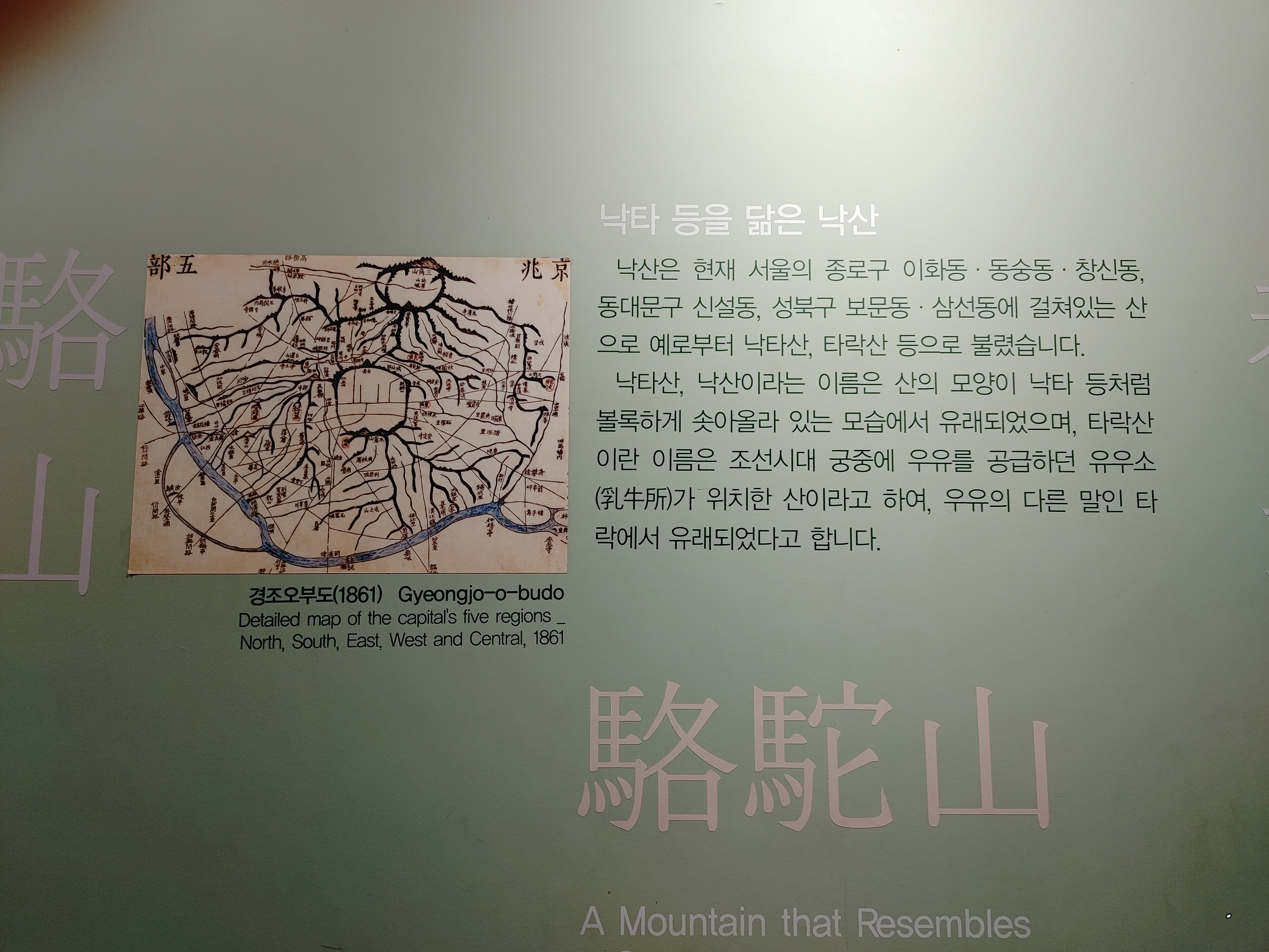 낙타등을 닮아서 낙타산, 낙산이라는 명칭이 유래 하였습니다. 타락산이라는 명칭도 있는데 조선시대에 궁중에 우유를 공급하는 유우소가 위치한 산이 낙산인데 우유의 다른 말인 타락에서 유래되어 낙산을 타락산이라고도 합니다.