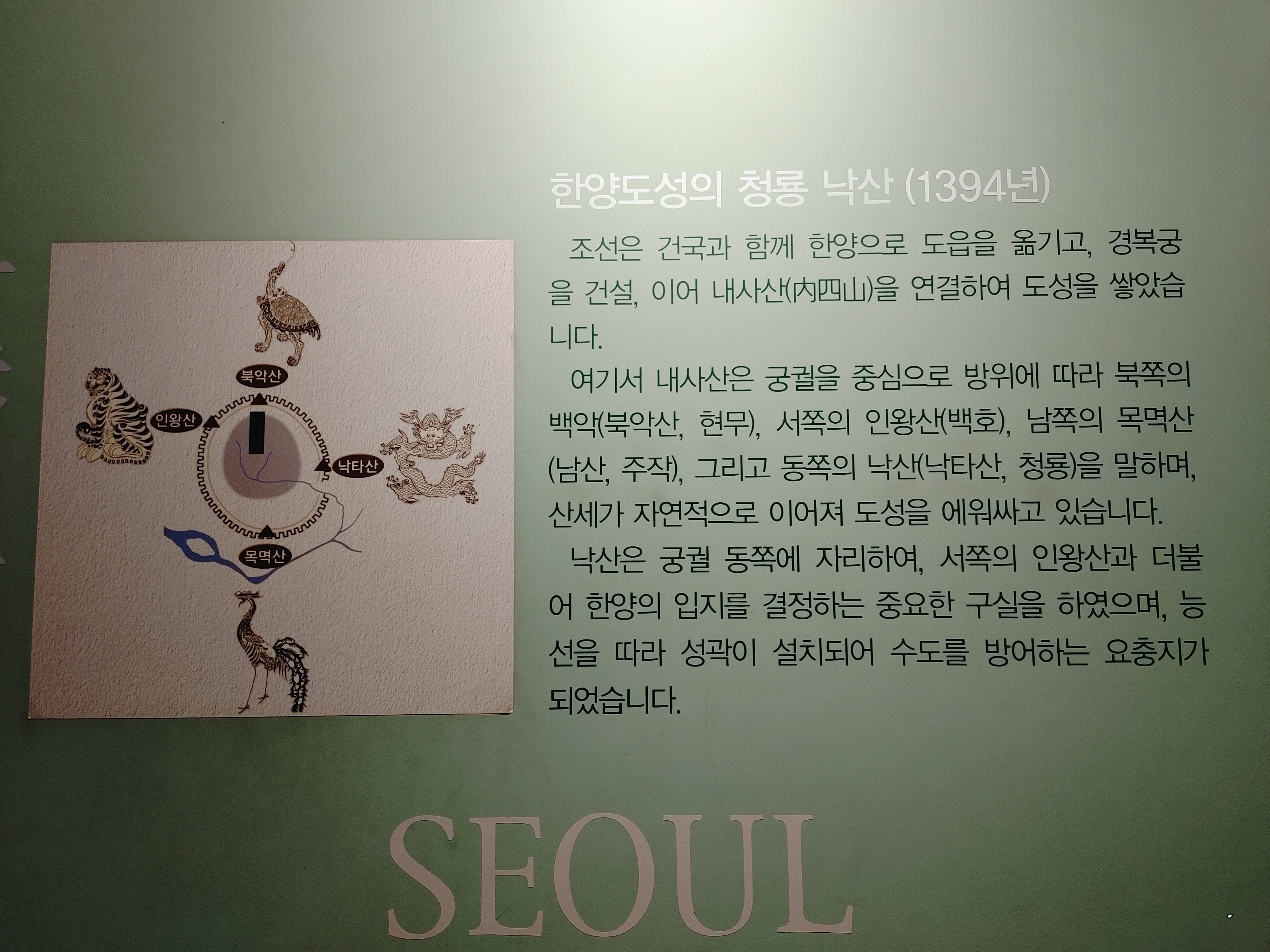 북쪽은 북악산(현무), 서쪽은 인왕산(백호), 남쪽은 남산(주작), 동쪽은 낙산(청룡)의 4개의 산들이 도성을 에워싸고 능선을 따라 성곽을 설치하여 수도를 방어하는 요충지 역활을 하였다고 합니다